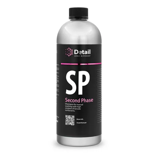 Second Phase (SP) позволяет после предварительной фазы мойки бережно удалить статические загрязнения. Безопасен для ЛКП. Не наносит химических и механических повреждений. Не содержит восков, силиконов, консервантов и других усилителей блеска, обладает повышенной моющей способностью. Отлично подходит для промывания труднодоступных мест (шильды, примыкание молдингов, ниши бамперов, стыки кузовных панелей) при помощи кисти и щётки. Рекомендуется к использованию во время второй фазы мойки перед нанесением реакционных защитных покрытий.