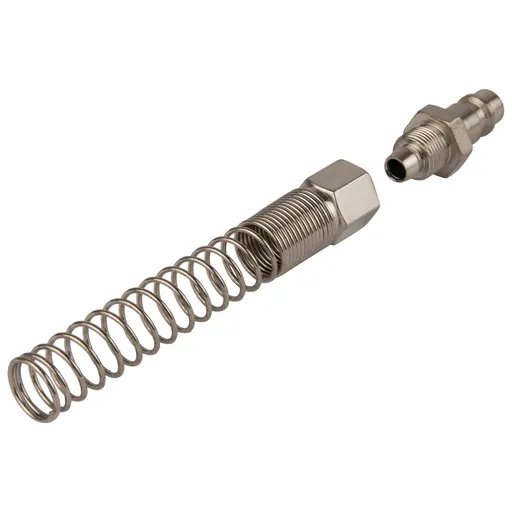 Предназначен для присоединения к пневматическим шлангам через обжимное крепление. Пружина предотвращает перегибы шланга. Применяется совместно с быстросъемным соединением «мама».