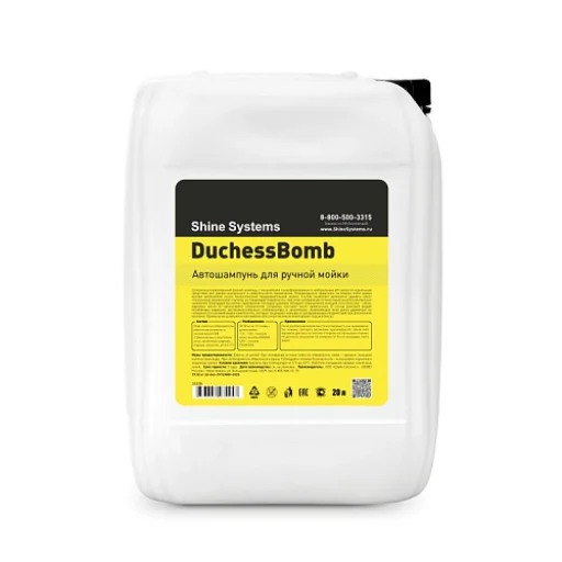 Shine Systems DuchessBomb Shampoo в максимальной фасовке 20 литров. Тот же суперконцентрат с нейтральным pH 6.5-7.5, густой пеной и грушевым ароматом, но в формате для моек с серьезной загрузкой. Одной канистры хватает на несколько сотен автомобилей - точный расход зависит от пропорции разведения и размера машин. Для мойки, где за смену проходит 15-20 авто, 20 литров закрывают потребность на пару месяцев.