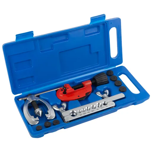 • Полная комплектация: Все необходимое для резки и развальцовки в одном наборе: тиски, труборез, матрица и 7 пуансонов.