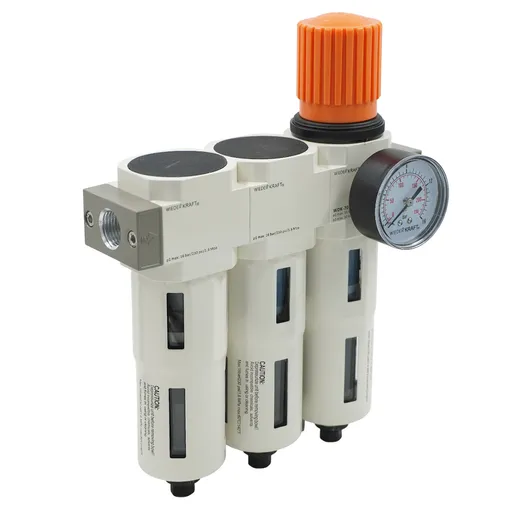 Блок подготовки воздуха 1/2" трехступенчатый с влаго-маслоотделителем, регулятором и манометром WiederKraft WDK-70740FA - это система подготовки воздуха для работы с пневматическим инструментом.