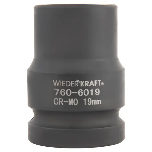 Головка ударная 6-гранная WiederKraft WDK-760-6019 применяется при проведении слесарных работ для демонтажа/монтажа резьбовых соединений с помощью инструмента ударного действия (пневматические и электрические гайковерты).